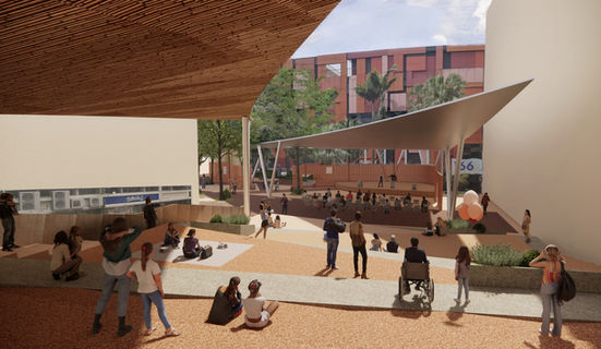 The existing imposing expanse of staircase was proposed to be replaced by a stair ramp which considers accessibility and is where smaller ‘plazas’ where pop-up events such as a community market or movie nights could occur.